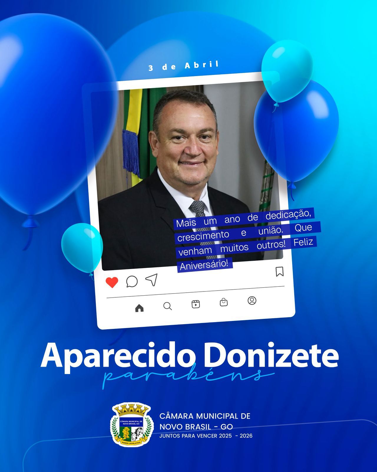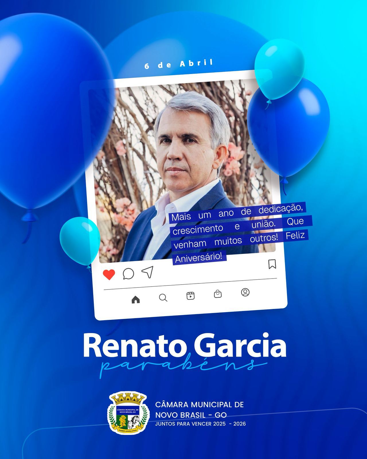 Parabéns, Renato Garcia. 🎉 Neste dia especial, a Câmara Municipal de Novo Brasil-GO registra seus cumprimentos ao senhor Renato Garcia…